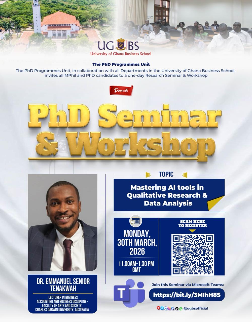Ready to level up your research? Join UGBS on March 30th for a hands-on seminar on AI tools in qualitative research with Dr. Emmanuel Tenakwah. Donβt miss it!
